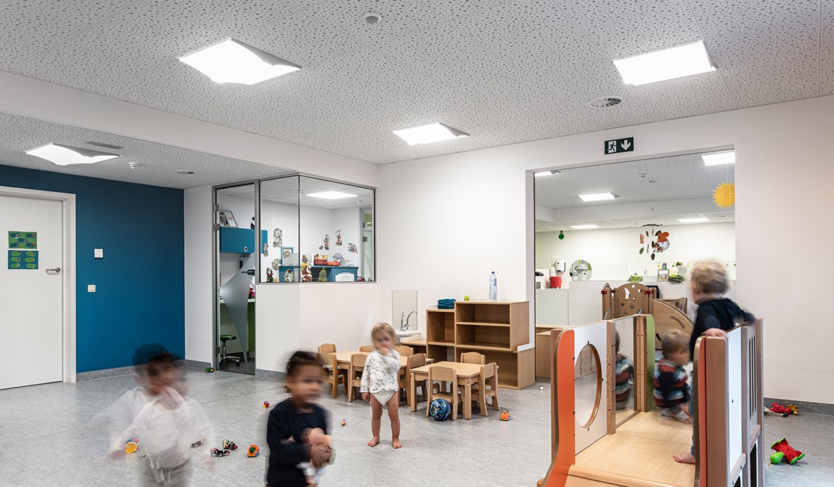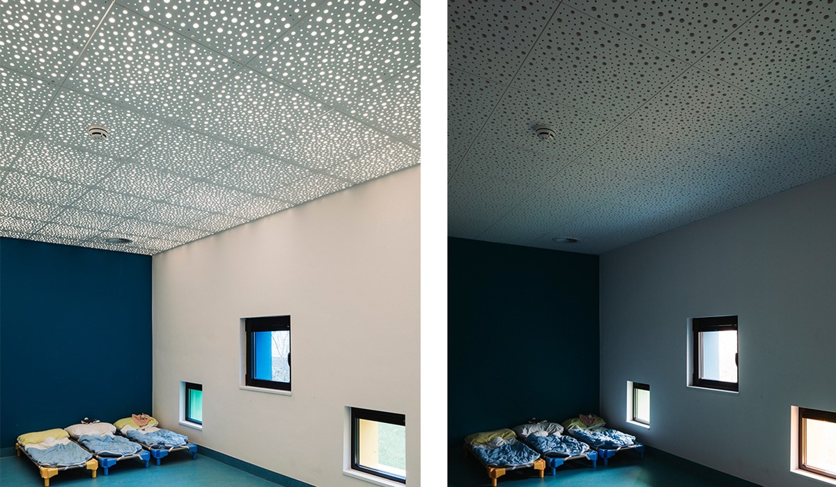 Contur Unity with Unity 8/15/20 perforation design invites you to be playful with material. This is exactly what architects at Flemalle kindergarten have done by placing lighting at the back of the ceiling and let the light shine through the perforations in the ceiling.