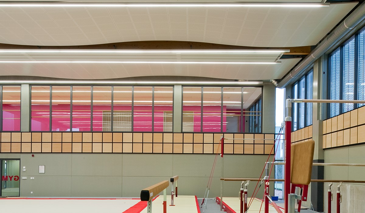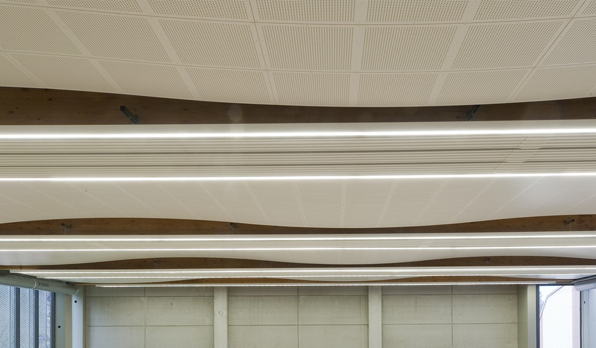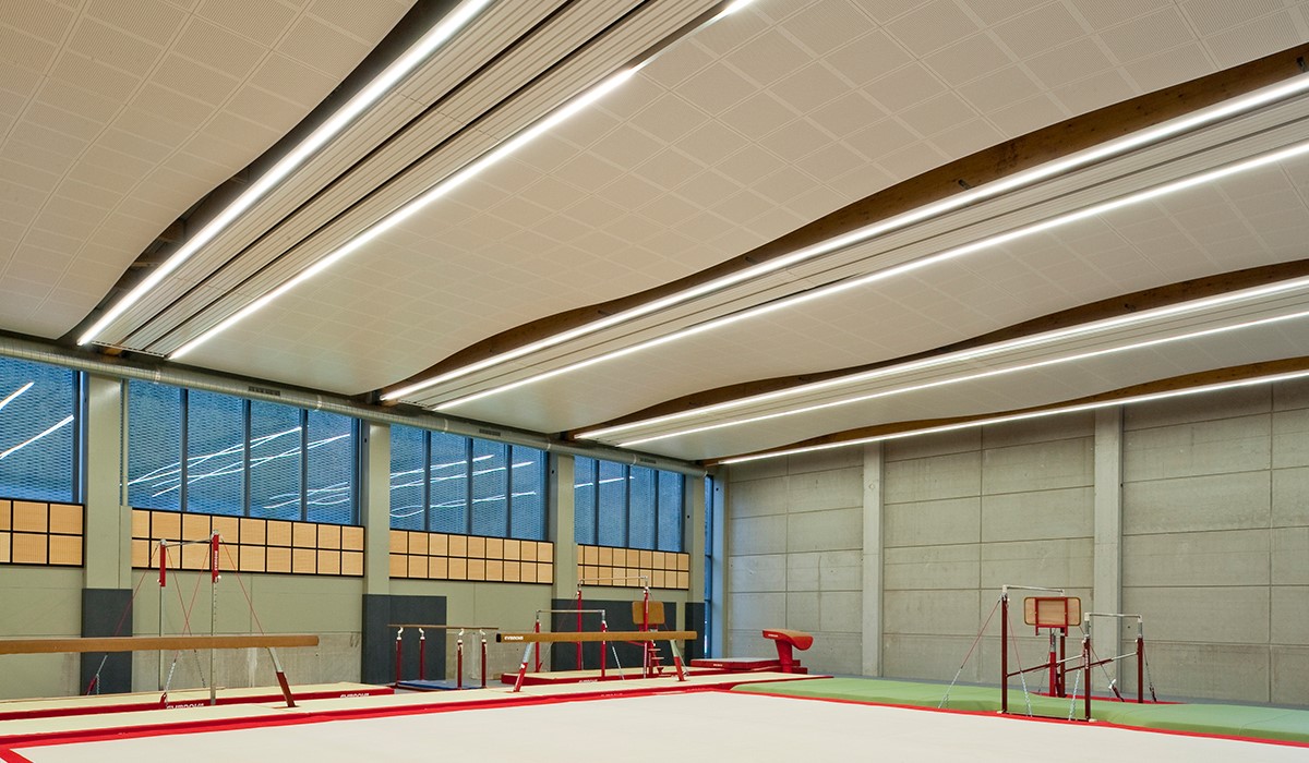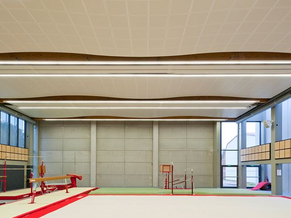 A ceiling in a gymnasium has two primary functions: reduce noise and endure heavy impact. Architects at Salaignac-Camarra were looking for just that: a robust ceiling solution that could withstand blows and ensure excellent sound environment. To strengthen the acoustical design even more, the architects wanted to create a curved ceiling construction that would diffuse the sound in the room.