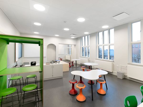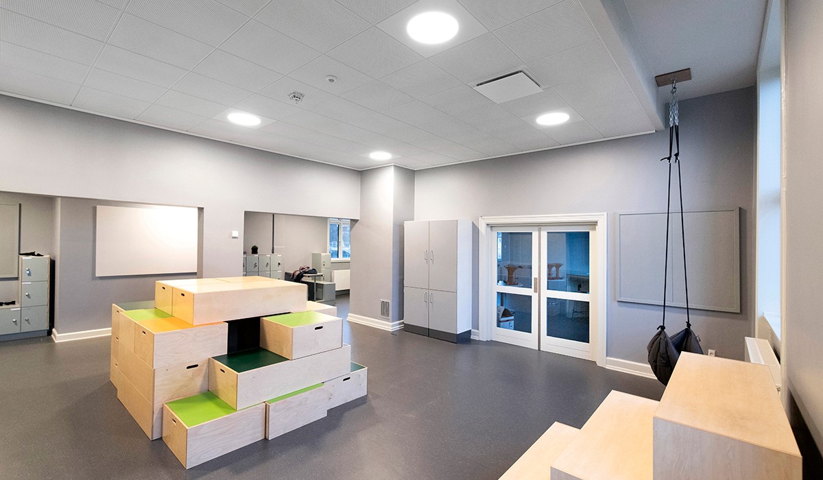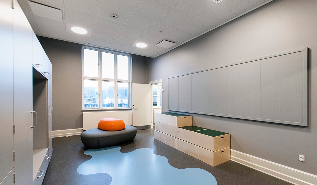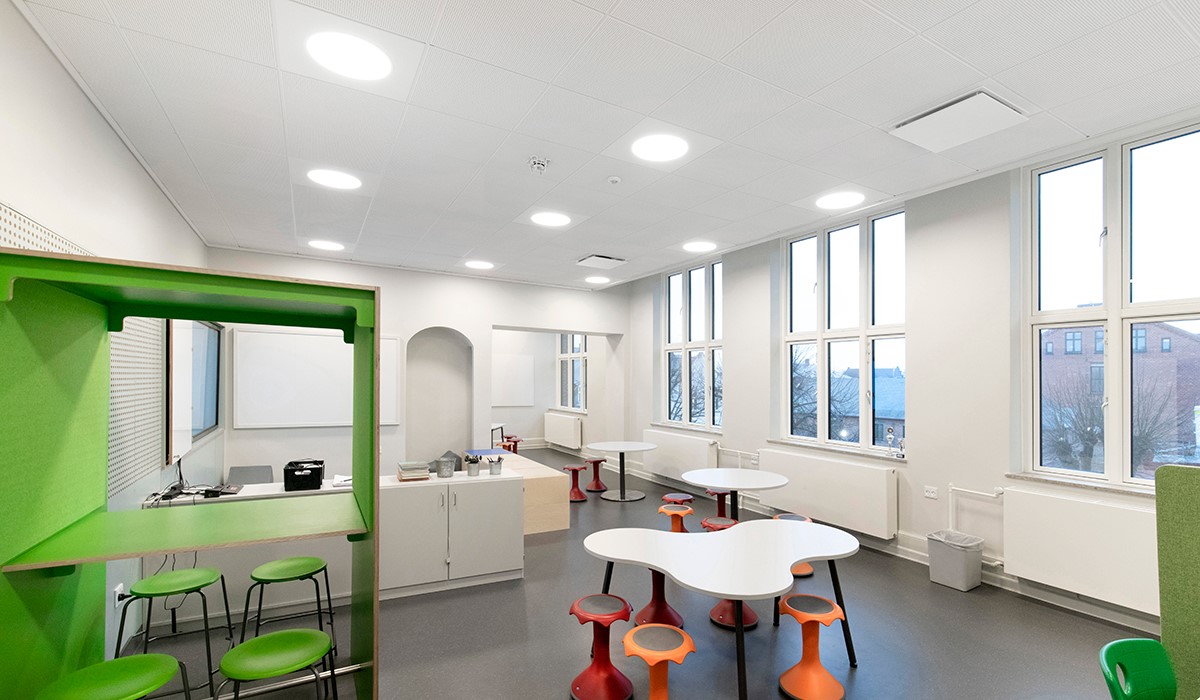 Fresh air is essential for children's well-being and ability to learn. At the city school of Elsinore, Denmark, pre-renovation measurements showed CO2 levels reaching up to 3000ppm during large parts of the day. That is three times the recommended levels. In addition, the acoustic enviroment was far from the required levels of 0.6seconds in reverberation time. So the listed school building from 1880 was in need of an extensive renovation.