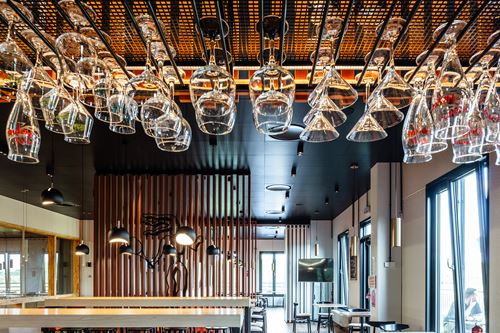 Black painted acoustic ceilings for a warm and cosy atmosphere