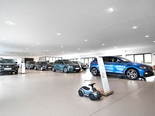 One of the major advantages of acoustic gypsum ceilings is that you are able to mix and match different ceiling types and still achieve an aesthetic and functional coherent between the different solutions. The VW Scherer Autohaus in Wiesbaden, Germany is a good example of this opportunity that gypsum offers you. In this project, architects have installed a fixed Solopanel ceiling in parts of the showroom to achieve a monolithic acoustic surface. And in order to ensure access to the installations in the rest of the building, they have used Contur demountable ceiling tiles, installed in a concealed T-grid structure.