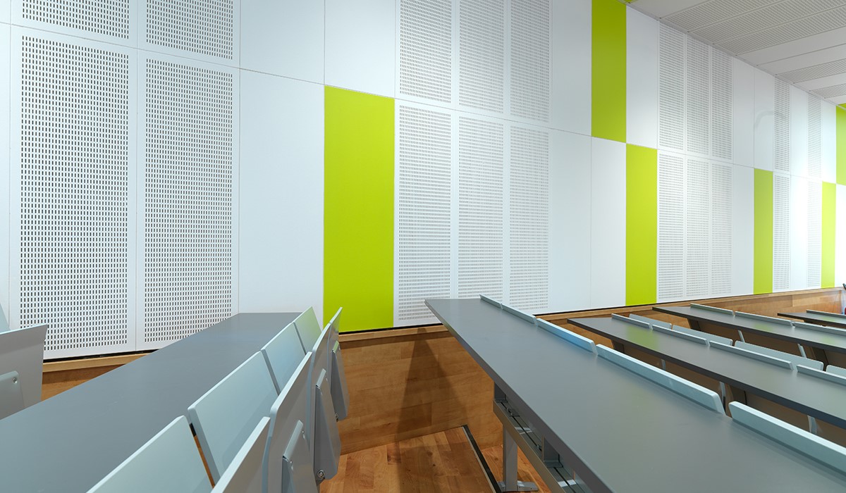 The flexibility of gypsum and the wide range of sizes make Tectopanel a highly versatile acoustic solution. You can install Tectopanel on ceiling or walls. You can curve the perforated panels. And you can apply colours of your choice on site.