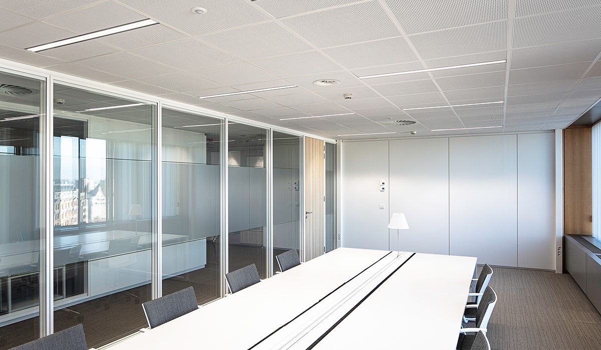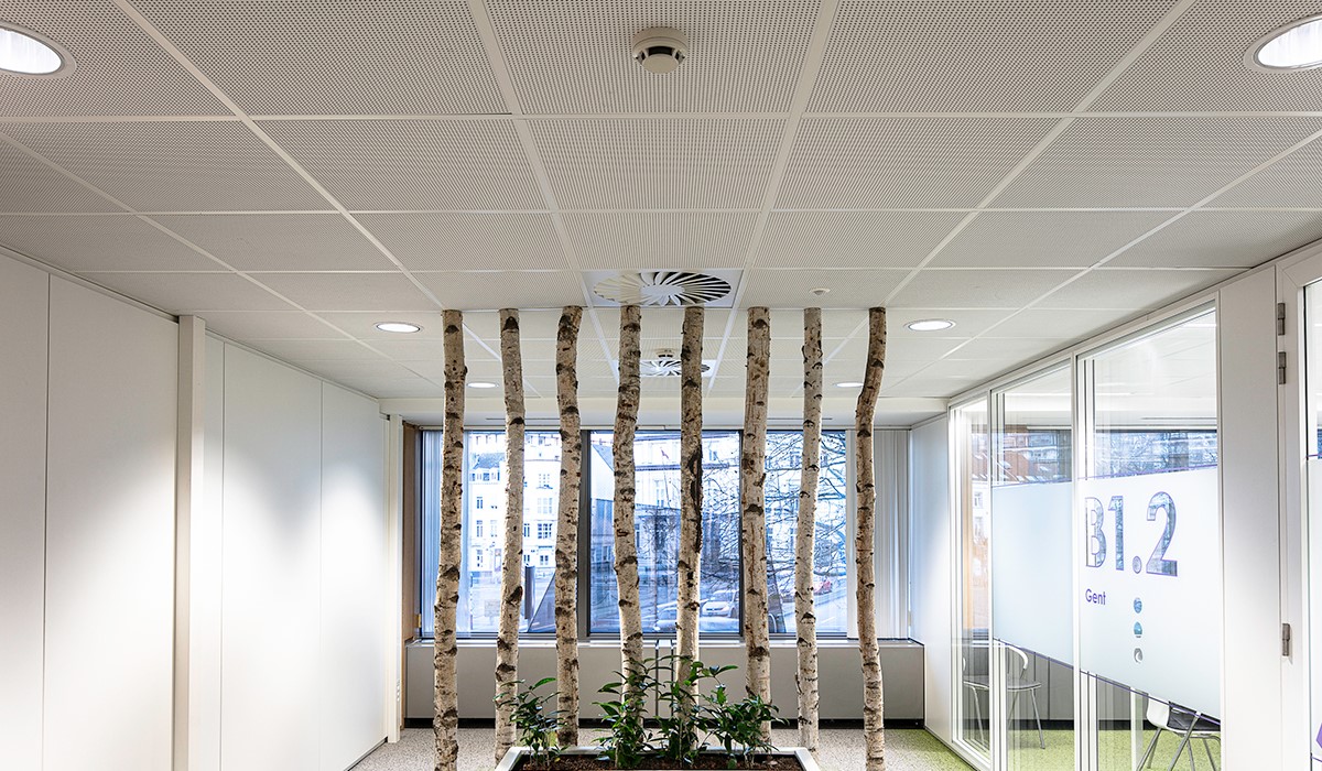 Plaza Unity is tested and approved for diffuse ventilation. With Plaza Unity as so-called ventilation ceiling, there is no need for air inlets in the ceiling. Fresh air is blown into the cavity of the ceiling and moves evenly into the room through the acoustical tiles. Advantage: no crossing ducts; savings of up to 50 cm room height; no draught in the room.