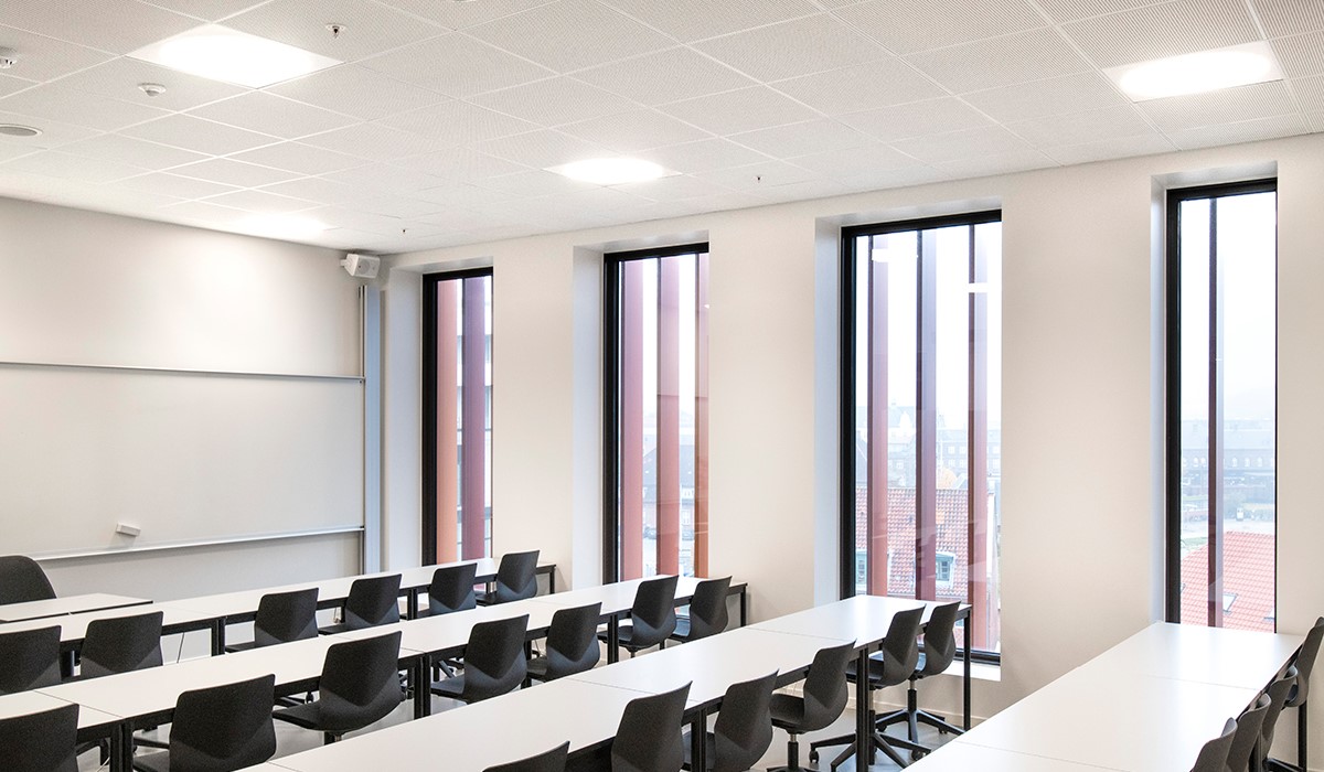 Plaza Unity is tested as a vandal-proof ceiling which makes it suitable for classrooms and other rooms with risk of impact to the ceiling. The ceiling tiles are tested for safety against ball throwing and rated class 3A: secure against ball throwing according to DIN 18032-3 and resistant against impact according to DIN EN 13964.
